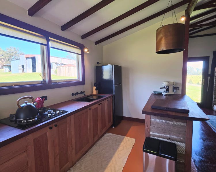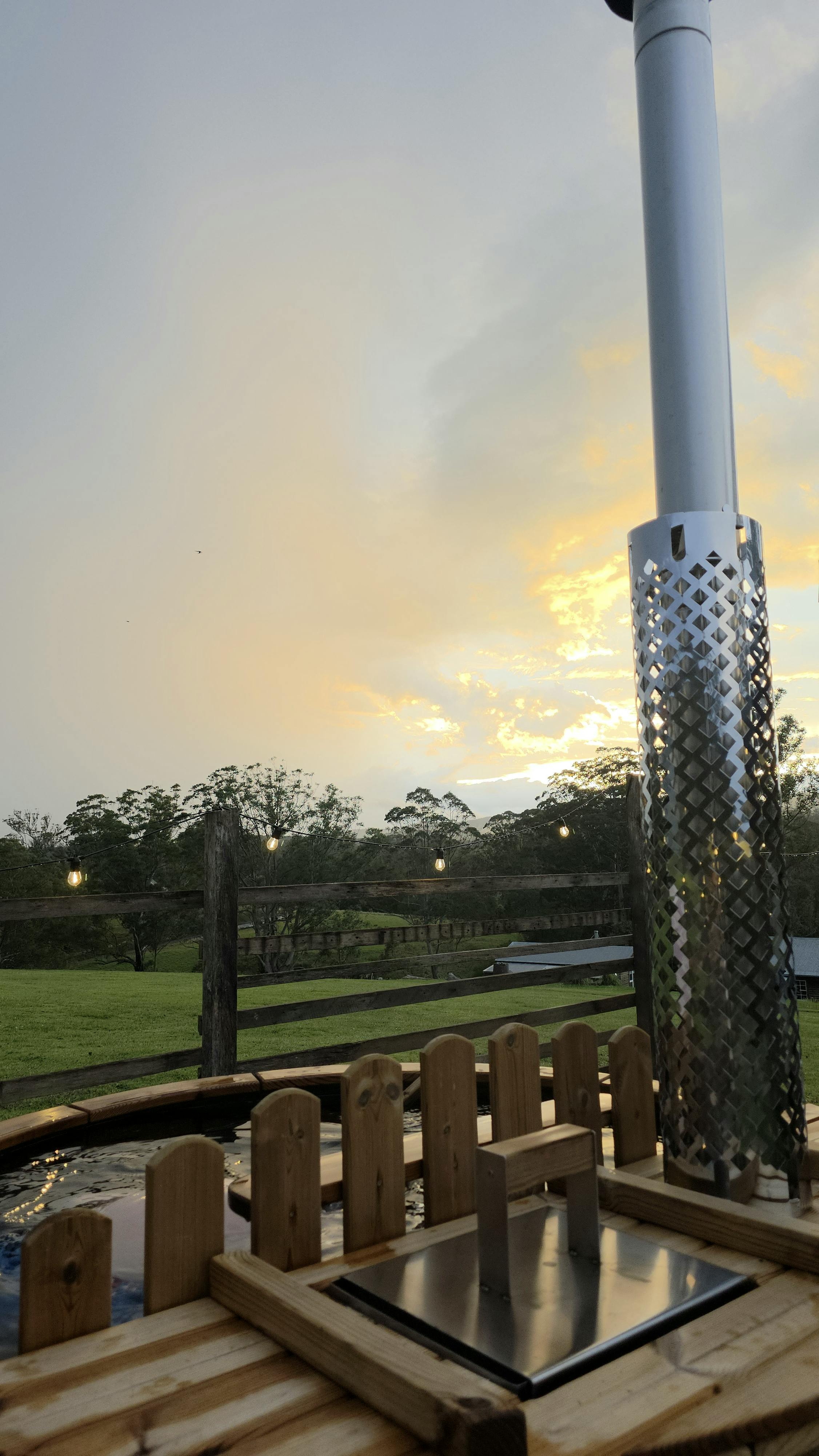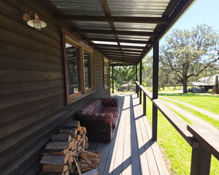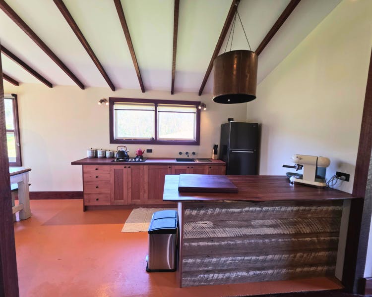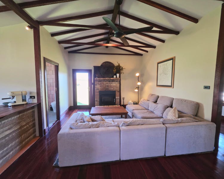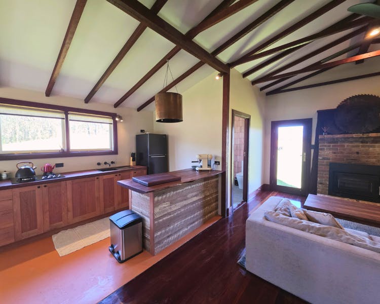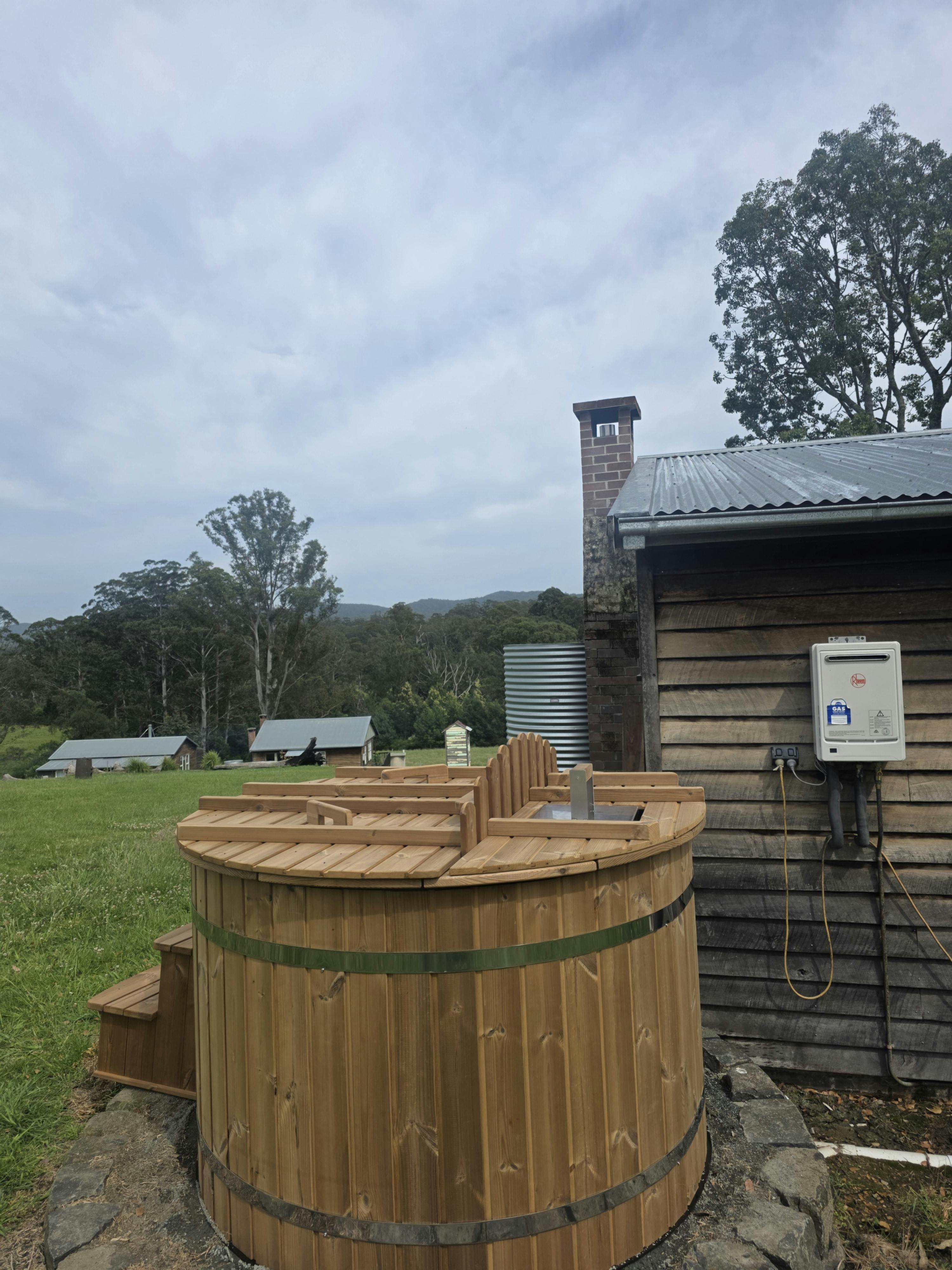 Kurrajong House is a beautifully restored three-bedroom timber worker's cottage perched on a hill, offering a serene escape separate from the other homes in the Old Saw Mill Town. The master bedroom features a luxurious king-sized bed and a cozy open fireplace. The two single bedrooms are perfect for small groups or families. For an added touch of luxury, unwind under the stars in your newly installed Baltic wood-fired hot tub. This traditional outdoor tub is heated by a separate wood fire, creating a deeply relaxing and authentic experience. The home includes an open-plan living, kitchen, and dining area, and a bathroom with a spacious shower, toilet, and vanity. A large verandah wraps around the home's northern and western sides, offering breathtaking views of the sunrise and sunset from an elevated vantage point.