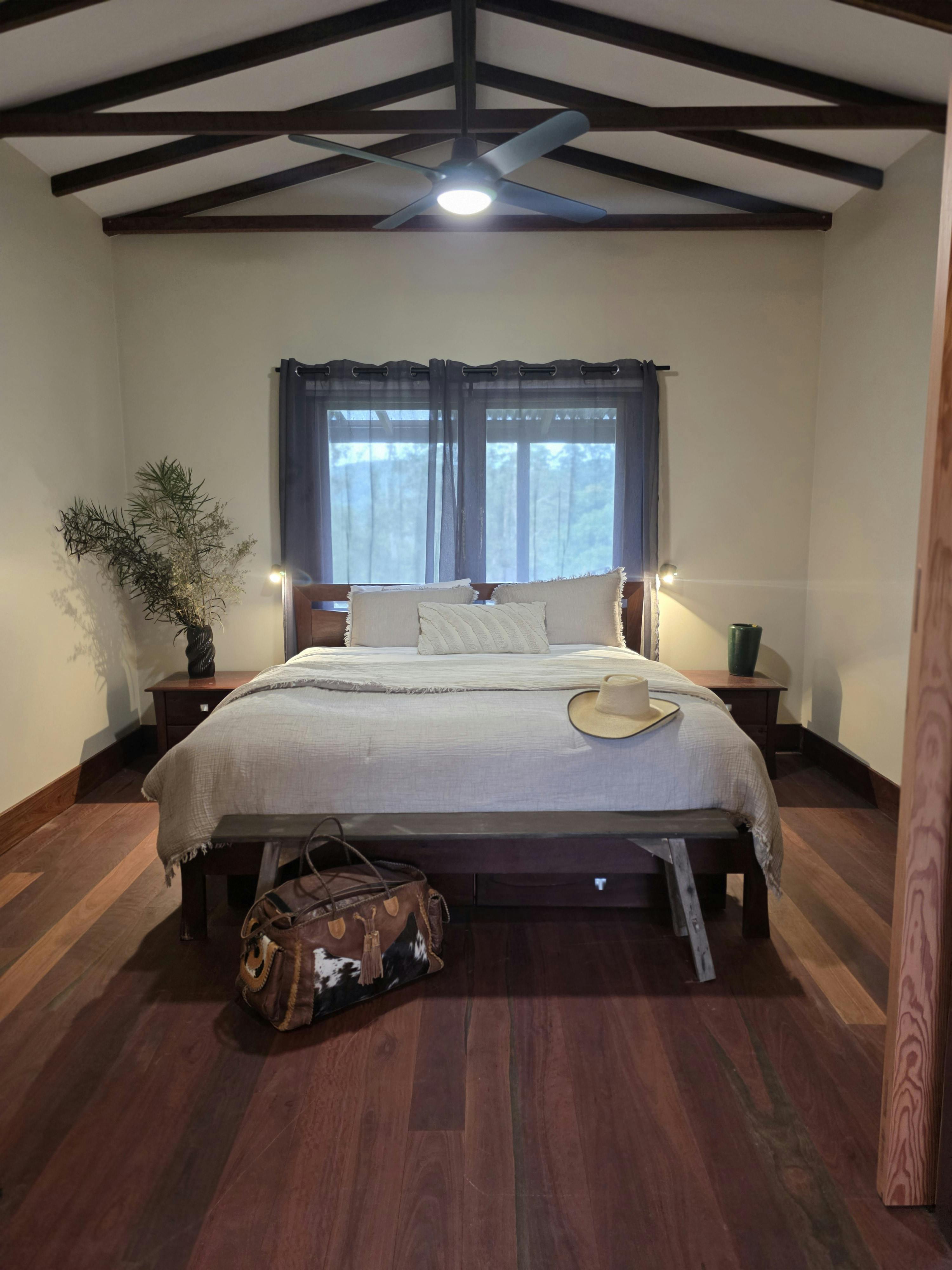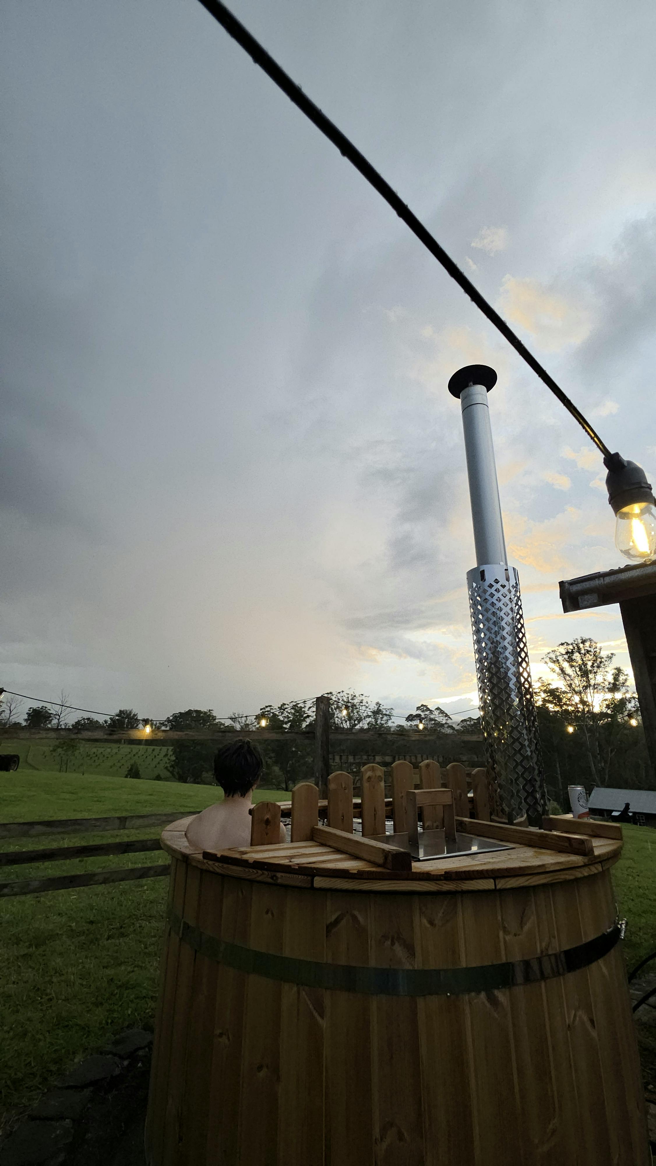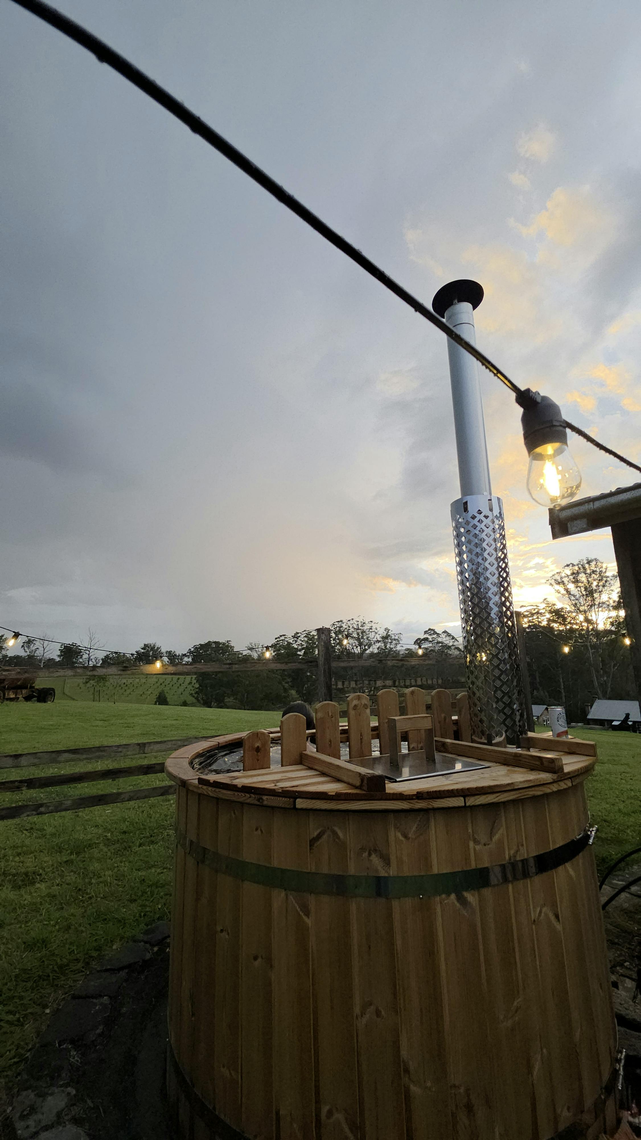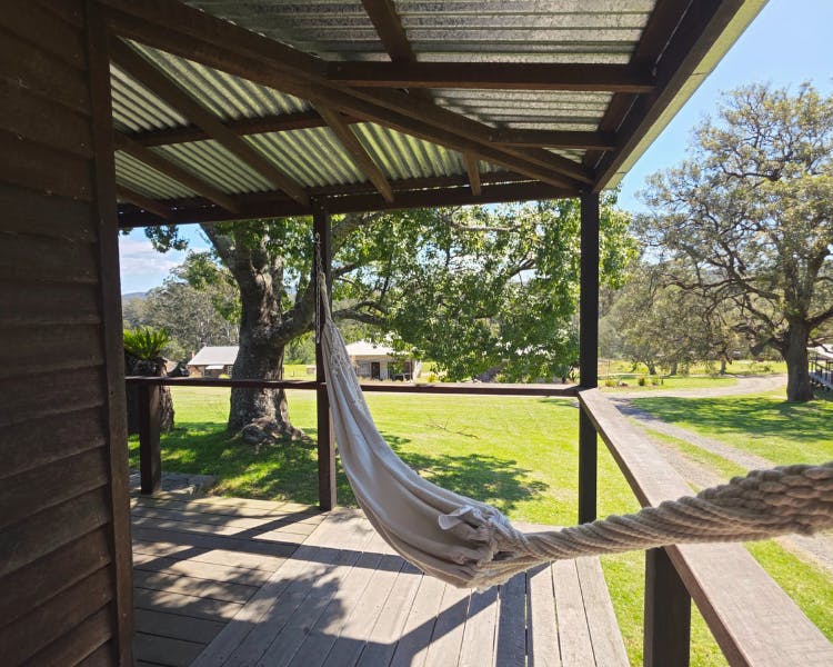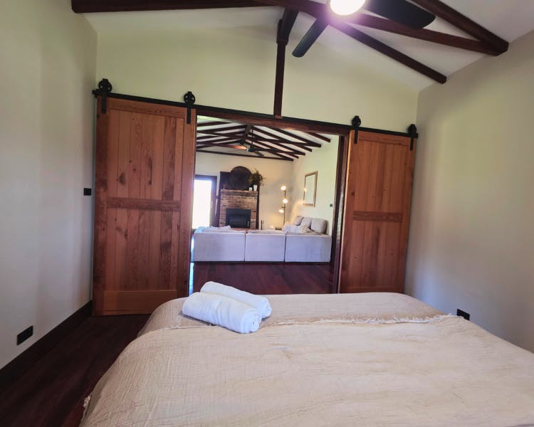 Kurrajong House is a beautifully restored three-bedroom timber worker's cottage perched on a hill, offering a serene escape separate from the other homes in the Old Saw Mill Town. The master bedroom features a luxurious king-sized bed and a cozy open fireplace. The two single bedrooms are perfect for small groups or families. For an added touch of luxury, unwind under the stars in your newly installed Baltic wood-fired hot tub. This traditional outdoor tub is heated by a separate wood fire, creating a deeply relaxing and authentic experience. The home includes an open-plan living, kitchen, and dining area, and a bathroom with a spacious shower, toilet, and vanity. A large verandah wraps around the home's northern and western sides, offering breathtaking views of the sunrise and sunset from an elevated vantage point.