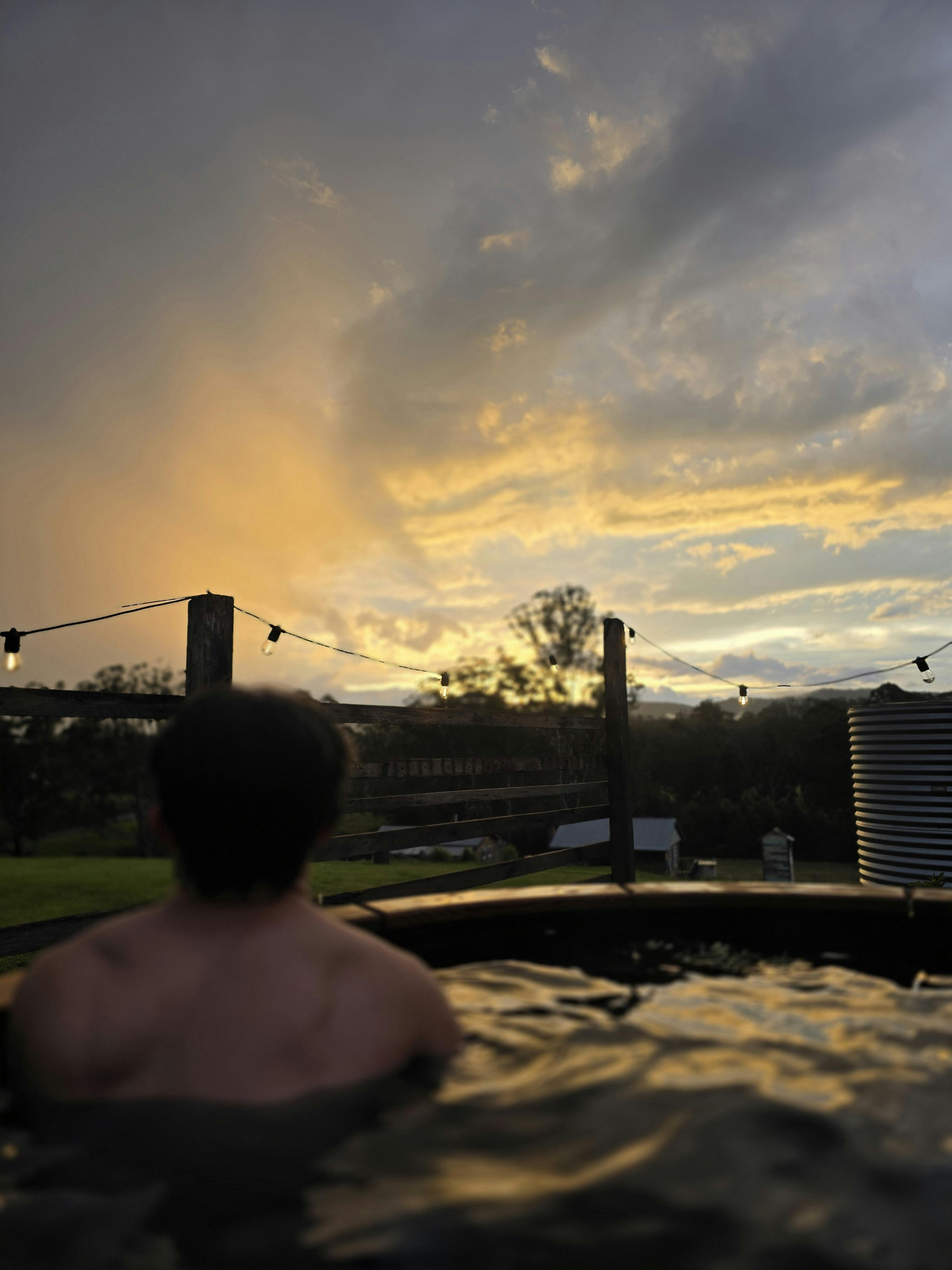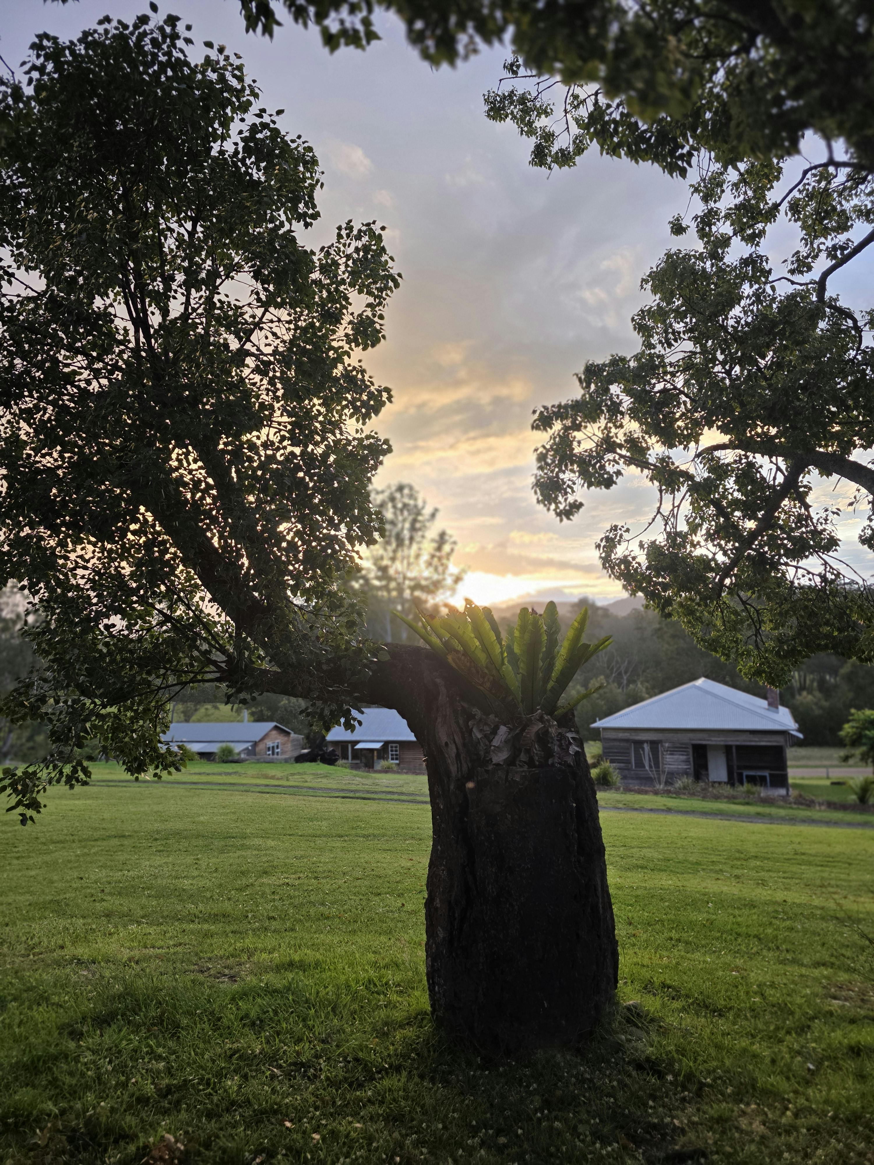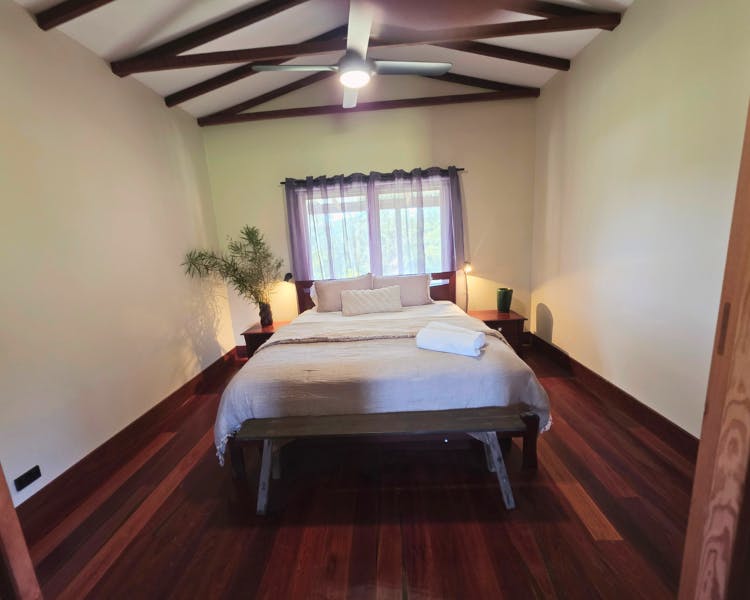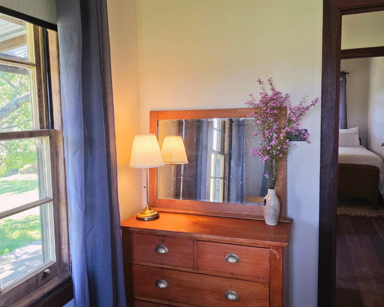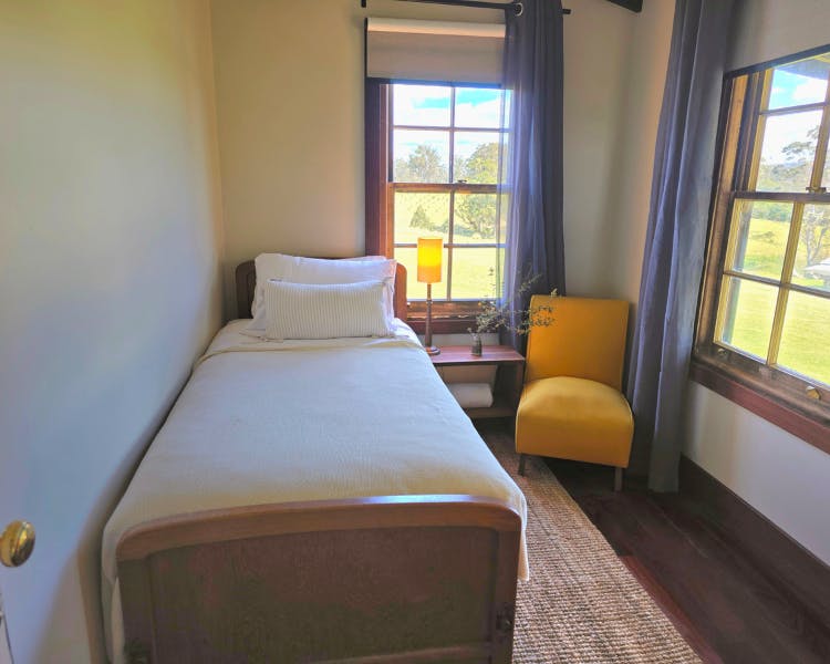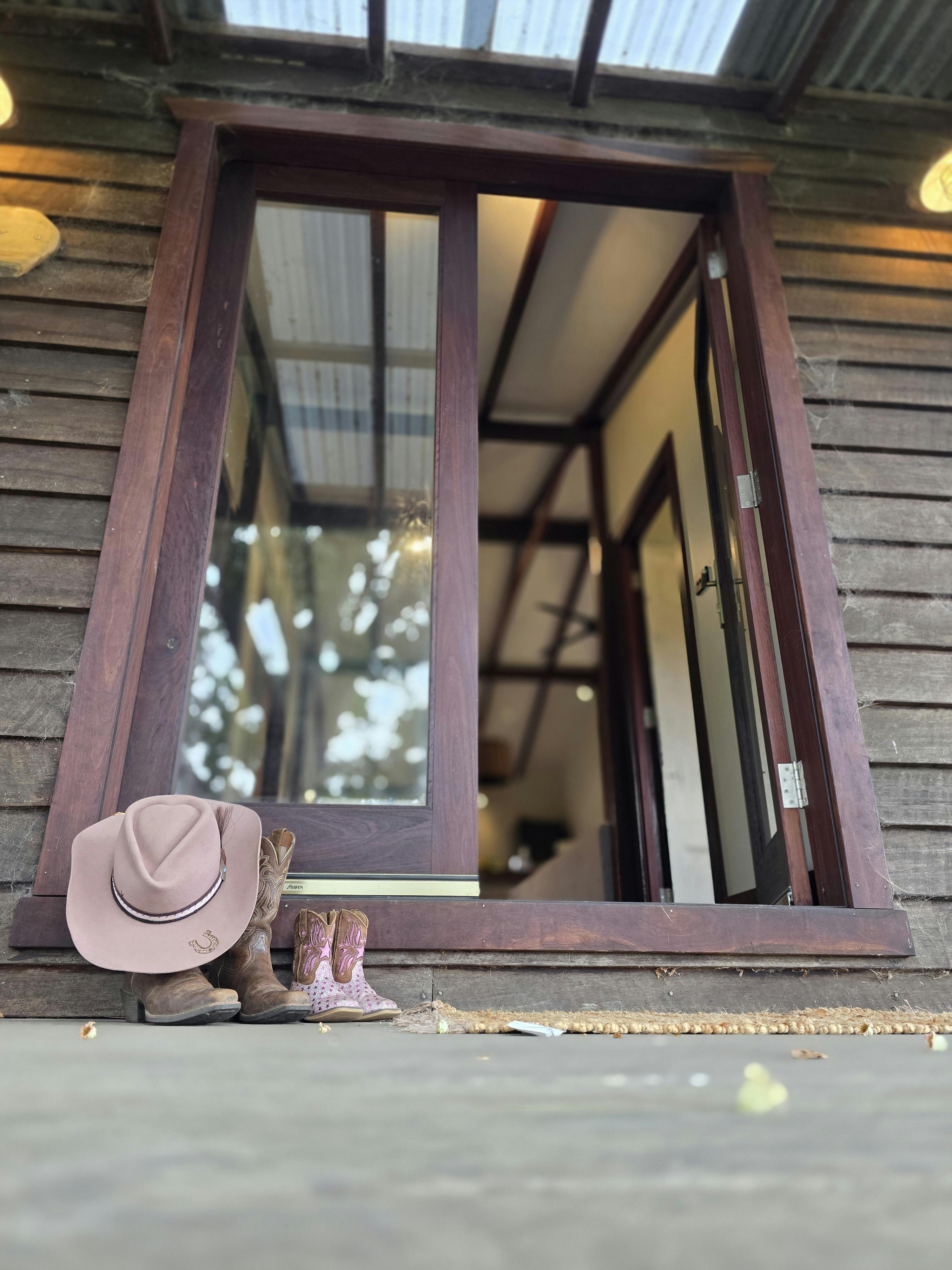 Kurrajong House is a beautifully restored three-bedroom timber worker's cottage perched on a hill, offering a serene escape separate from the other homes in the Old Saw Mill Town. The master bedroom features a luxurious king-sized bed and a cozy open fireplace. The two single bedrooms are perfect for small groups or families. For an added touch of luxury, unwind under the stars in your newly installed Baltic wood-fired hot tub. This traditional outdoor tub is heated by a separate wood fire, creating a deeply relaxing and authentic experience. The home includes an open-plan living, kitchen, and dining area, and a bathroom with a spacious shower, toilet, and vanity. A large verandah wraps around the home's northern and western sides, offering breathtaking views of the sunrise and sunset from an elevated vantage point.