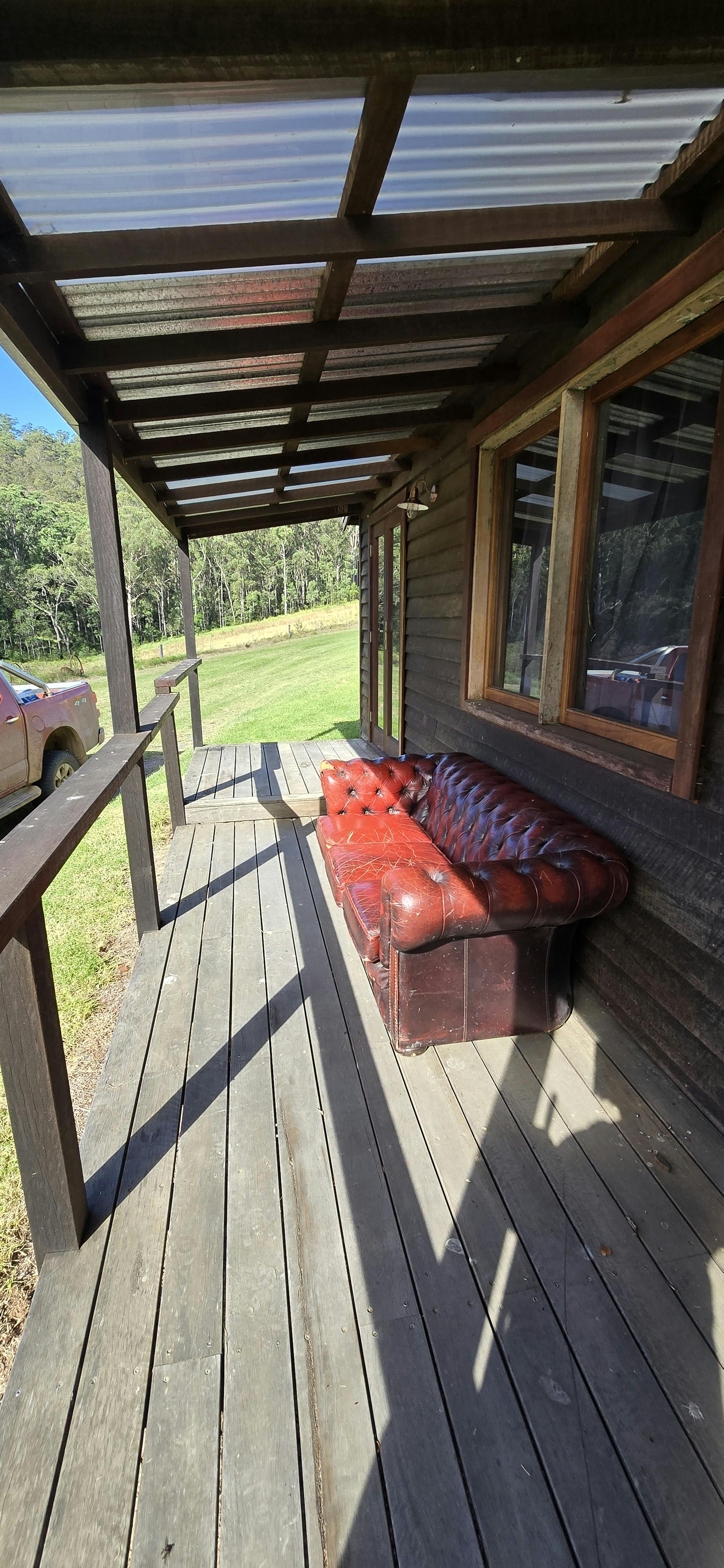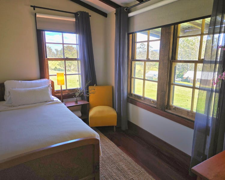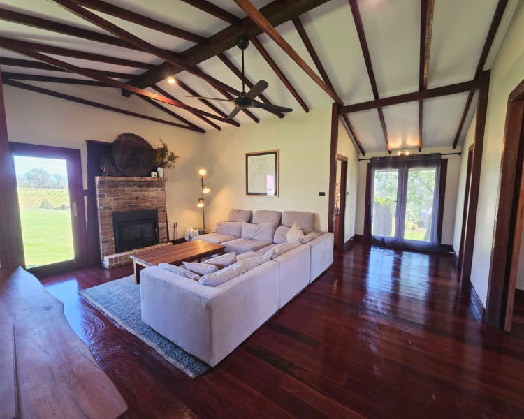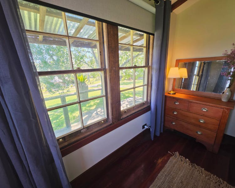This house is a beautifully restored timber worker's cottage, part of Brooman's Old Saw Mill Town. It is located up on the hill, separate from the other homes. It sits on a sprawling 2,750-acre farming property that borders the Clyde River.