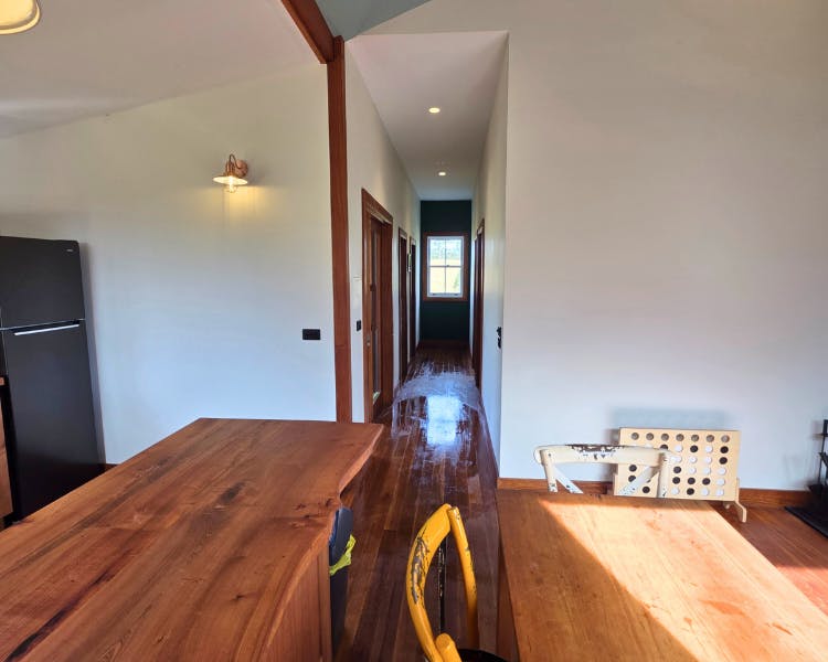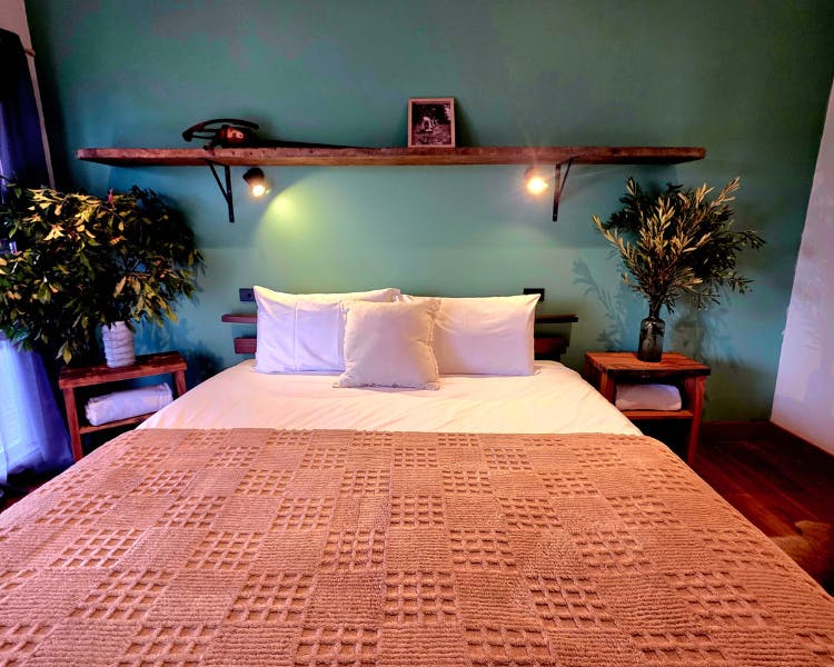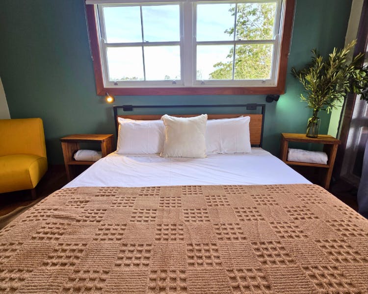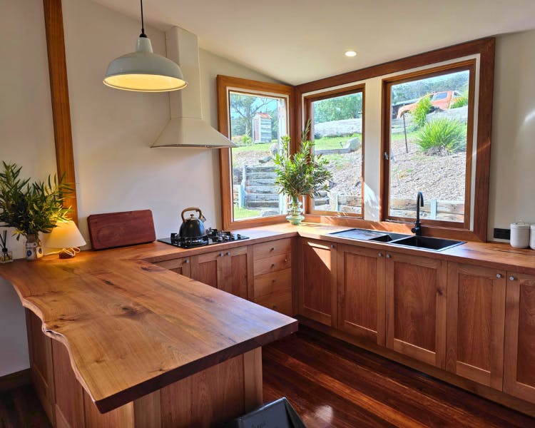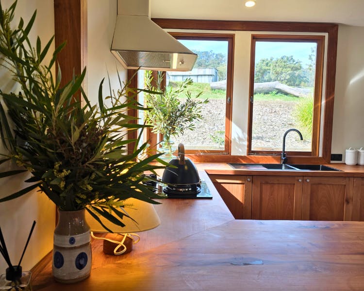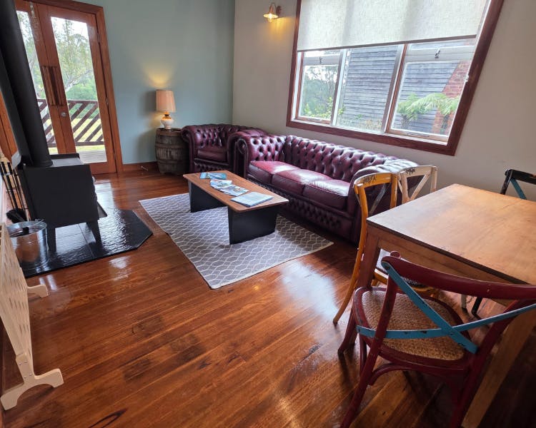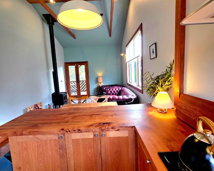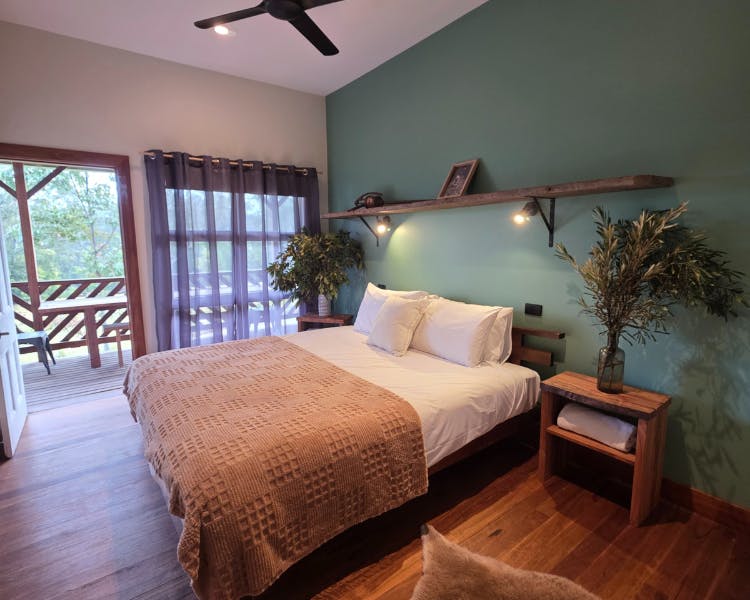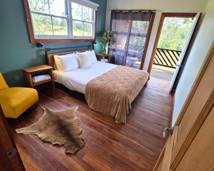 The Mill House is a restored cottage with two bedrooms, each with a king bed and a private door leading to the verandah.The spacious bathroom includes a soaking bath, separate shower, and a handcrafted Coachwood vanity. The open-plan living space features a cozy fireplace and a kitchen crafted from local Coachwood. An expansive timber deck extends the living space outdoors, complete with a daybed and a sitting area.