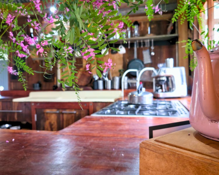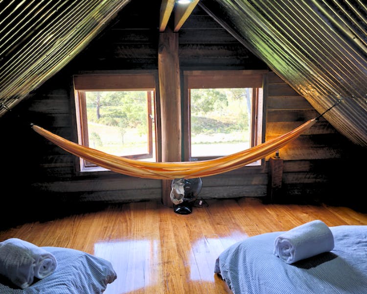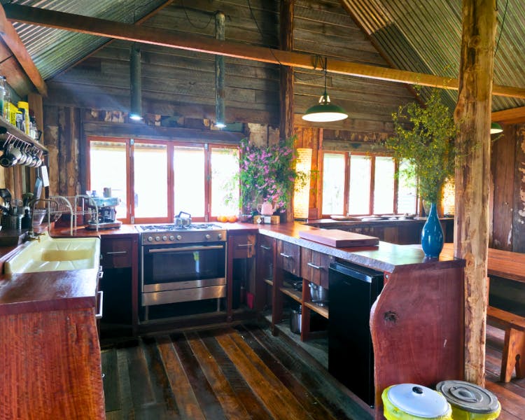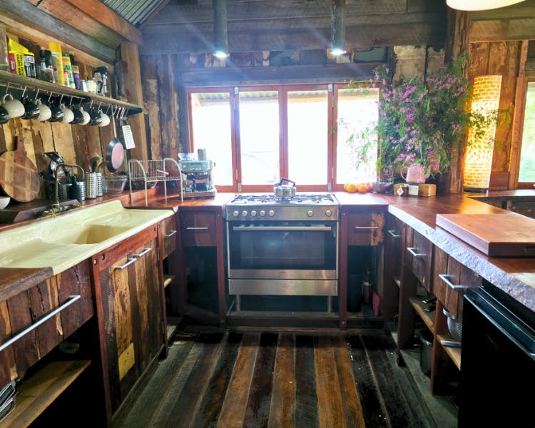 Mrs Myers House is a restored timber slab cottage with two queen bedrooms downstairs and a loft with two single futon beds. A fireplace provides a cozy atmosphere on cool evenings. The fully-equipped kitchen features blue gum slab bench tops and a large gas oven and stove. Verandahs overlook the Clyde River and Prospect Hill, offering a peaceful setting for relaxation.