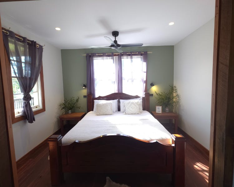 This house is one of six original timber worker's homes restored in the Old Saw Mill Town of Brooman. It was once the residence of the area's last teacher. The building is crafted from local timber, showcasing original floorboards, weatherboards, and Coachwood architraves. Only original, recycled, or locally sourced native timber was used in its restoration, preserving its authentic character.