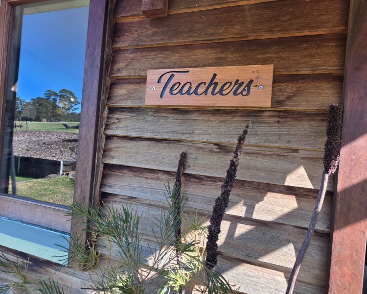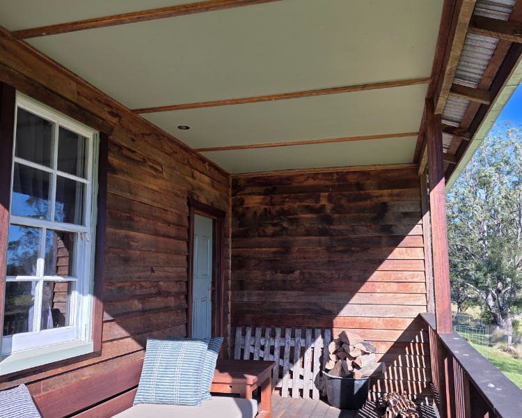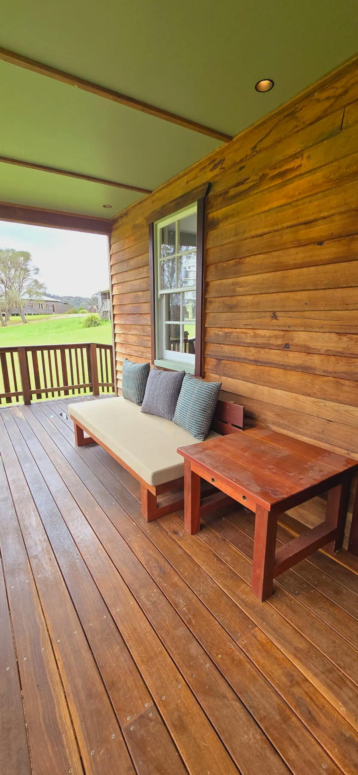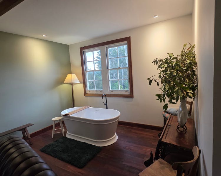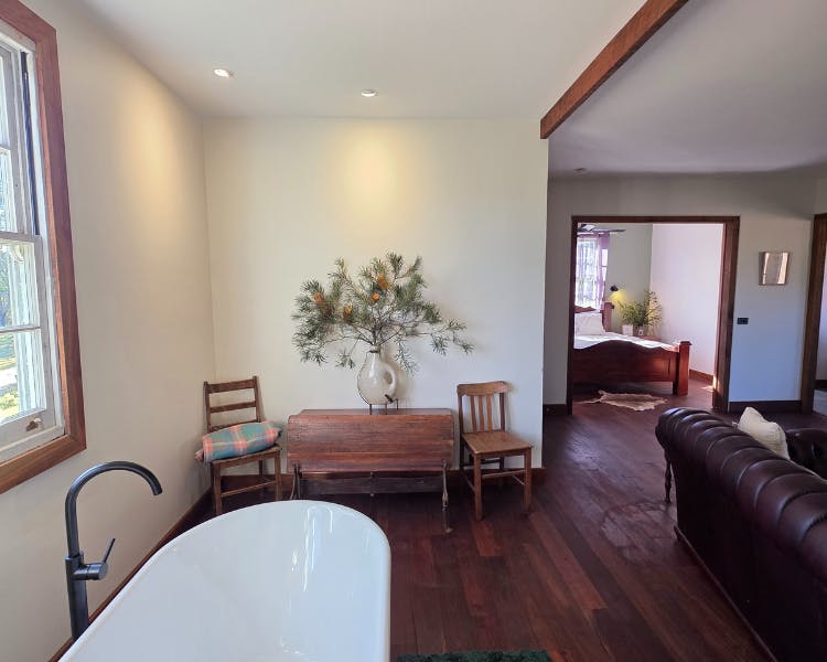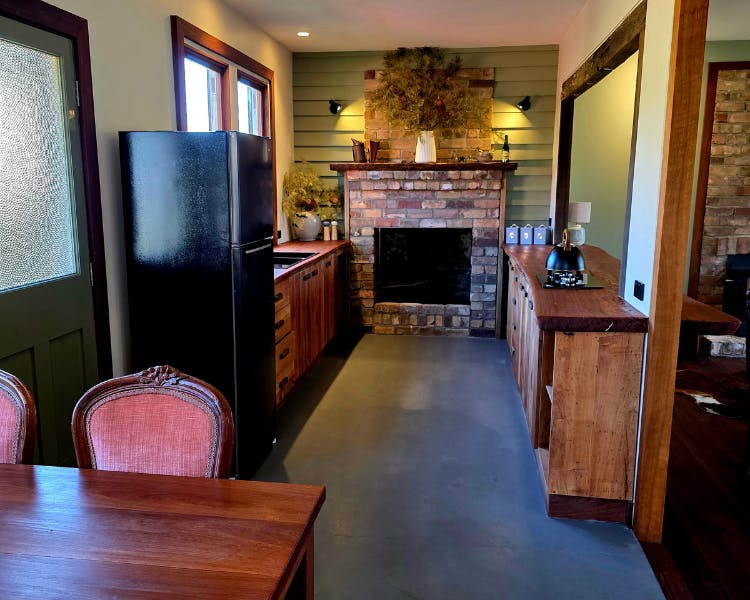 The Teachers House is a restored timber worker's home with a spacious bedroom that includes a king-size bed and a fireplace. A unique feature of this property is the deep-soaking bathtub in the lounge room, perfectly positioned to enjoy the glow of the fireplace. The home also has a well-appointed kitchen, a combined living and dining area, and a front balcony for unwinding in the evening.